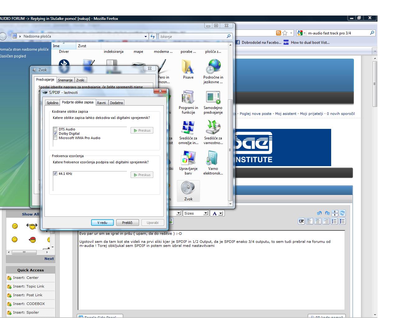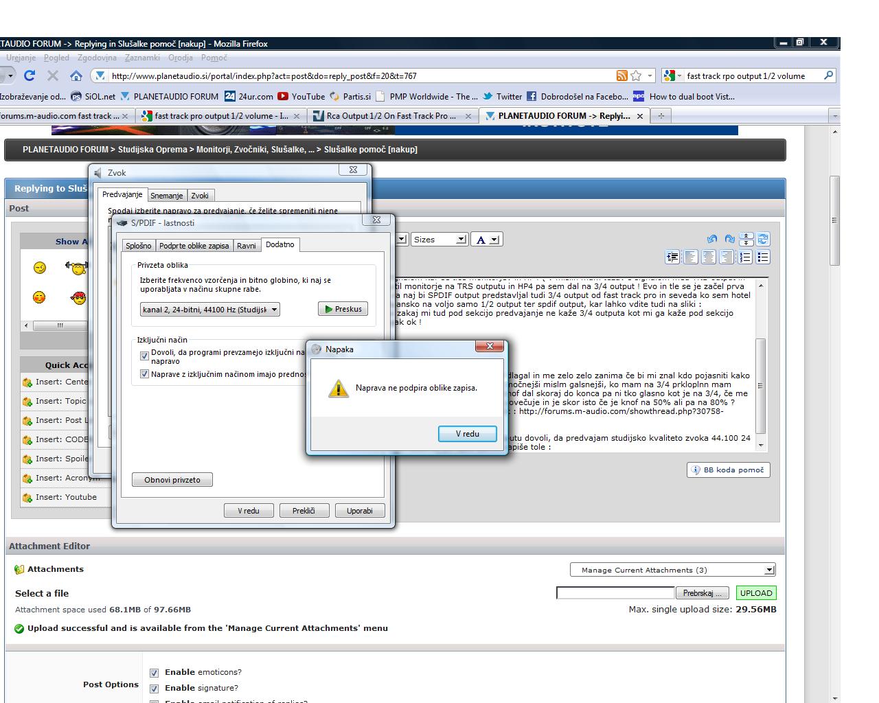 2. Nevem kok to vpliva na sound vendar me vseeno zanima : zakaj mi na 1/2 outputu dovoli, da predvajam studijsko kvaliteto zvoka 44.100 24 bit : planetaudio3.jpg ko pa hočm to naštimat pri spdif pa mi napiše tole : planetaudio4.jpg Ni mi jasno ??? Se mi pa zdi, da ta spdif ne vela isto kot za 3/4 output kot je rekel nekdo na m-audi forumu in se mi zdi da je dejansko to spdif ! Ker zakaj mi ga kaže pr sekciji snemanje pr sekciji predvajanje pa ne ?? Tud driverje vse sm updejtu tud vse ma obklukan tko k treba : planetaudio5.jpg !!! Uglavnem kar se tiče nastavitev je vse ql stoposto ! Zato mi ni jasno res ne !