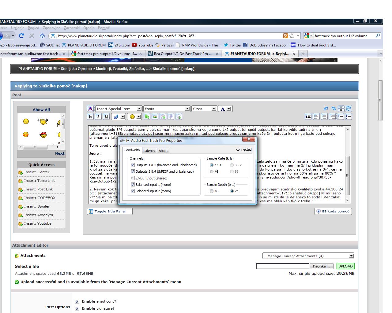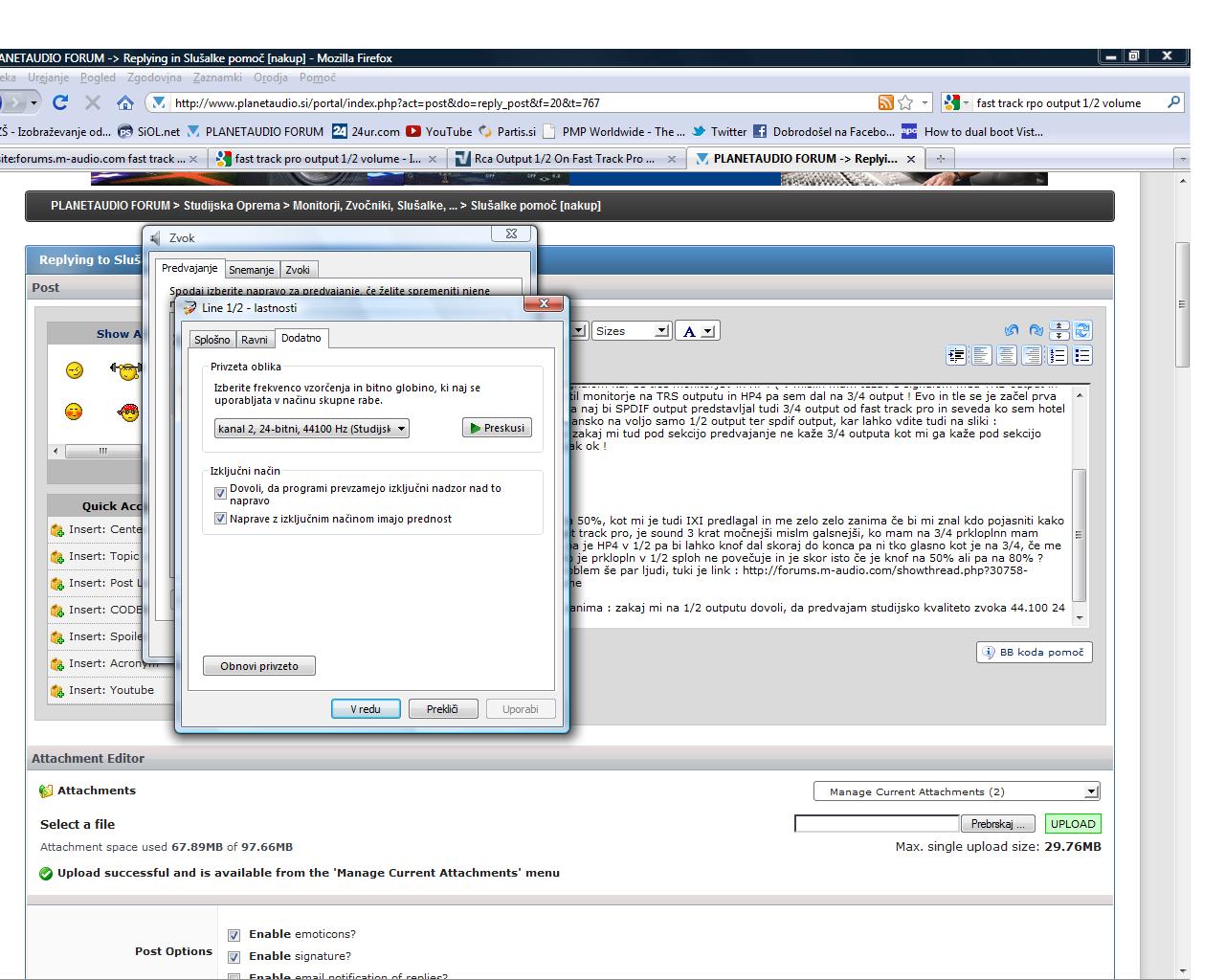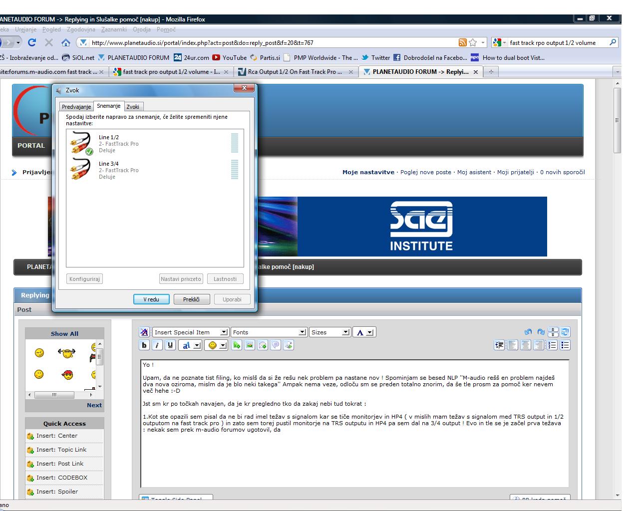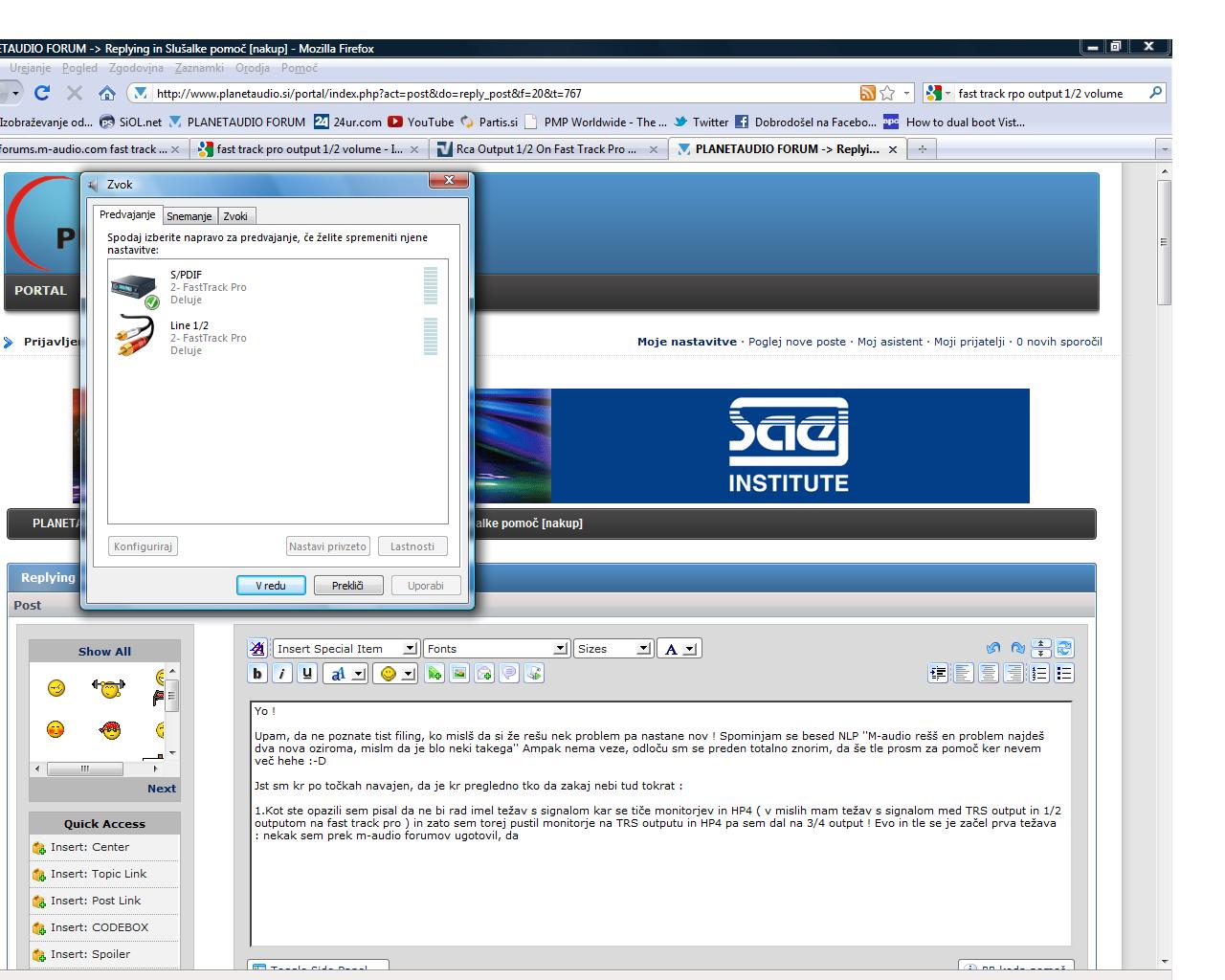 1.Kot ste opazili sem pisal da ne bi rad imel težav s signalom kar se tiče monitorjev in HP4 ( v mislih mam težav s signalom med TRS output in 1/2 outputom na fast track pro ) in zato sem torej pustil monitorje na TRS outputu in HP4 pa sem dal na 3/4 output ! Evo in tle se je začel prva težava : nekak sem prek m-audio forumov ugotovil, da naj bi SPDIF output predstavljal tudi 3/4 output od fast track pro in seveda ko sem hotel poštimat glede 3/4 outputa sem videl, da mam res dejansko na voljo samo 1/2 output ter spdif output, kar lahko vdite tudi na sliki : planetaudio1.jpg sicer mi ni jasno zakaj mi tud pod sekcijo predvajanje ne kaže 3/4 outputa kot mi ga kaže pod sekcijo snemanje : planetaudio2.jpg ampak ok !