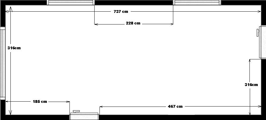 - miks mizo (50x100cm) bi potisnil čisto do absorberja ob severni steni. Monitorja na stojali, pač tudi ob absorber. Prostor je širok 316cm. Če odštejem vsaj 2 x 20cm = 40cm za absorberje na obeh nasprotnih stenah, ostane 276cm. Torej bo »sweet spot« nekje 90cm od stenskega absorberja, monitorja (ADAM A7) pa bosta 130cm vsaksebi. Torej tvoj predlagani 35-40%.