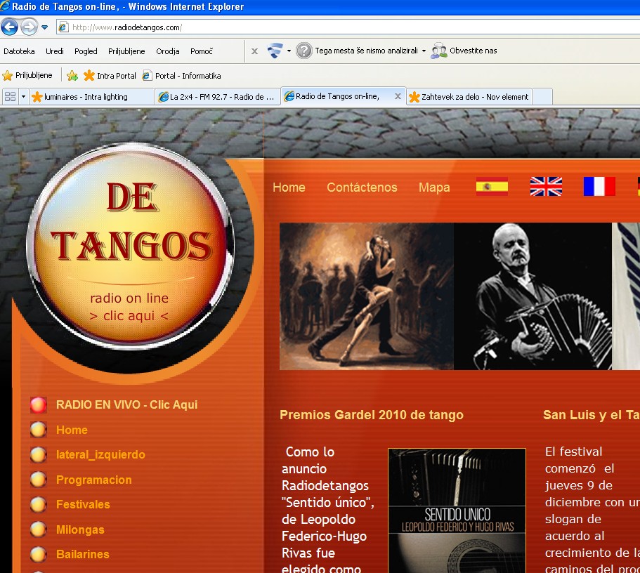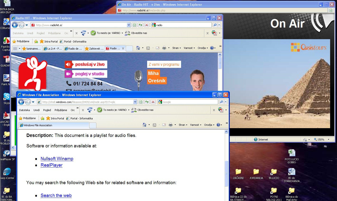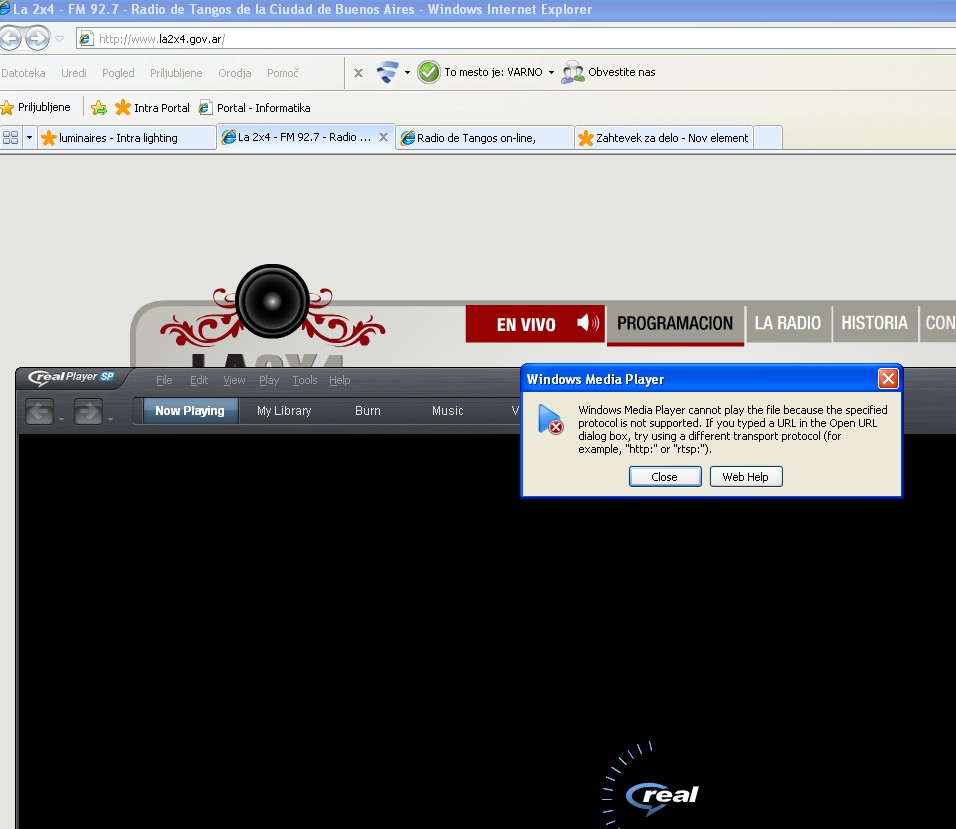 Od pred cca 2 tedna, ko se povežem na tipični dve postaji, ki sem jih na računalniku poslušal, ne vzpostavita več povezave. PC je HP laptop 6830s. Res je, da je pod nadzorom naših računalničarjev, ki pa pravijo, da niso nič intervenirali, saj na vseh PC od kolegov se povezave vzpostavijo tako kot pri meni prej. Prilagam izgled strani teh dveh postaj+ 1 kartako-HIT(enako z vsemi v živo in streaming).