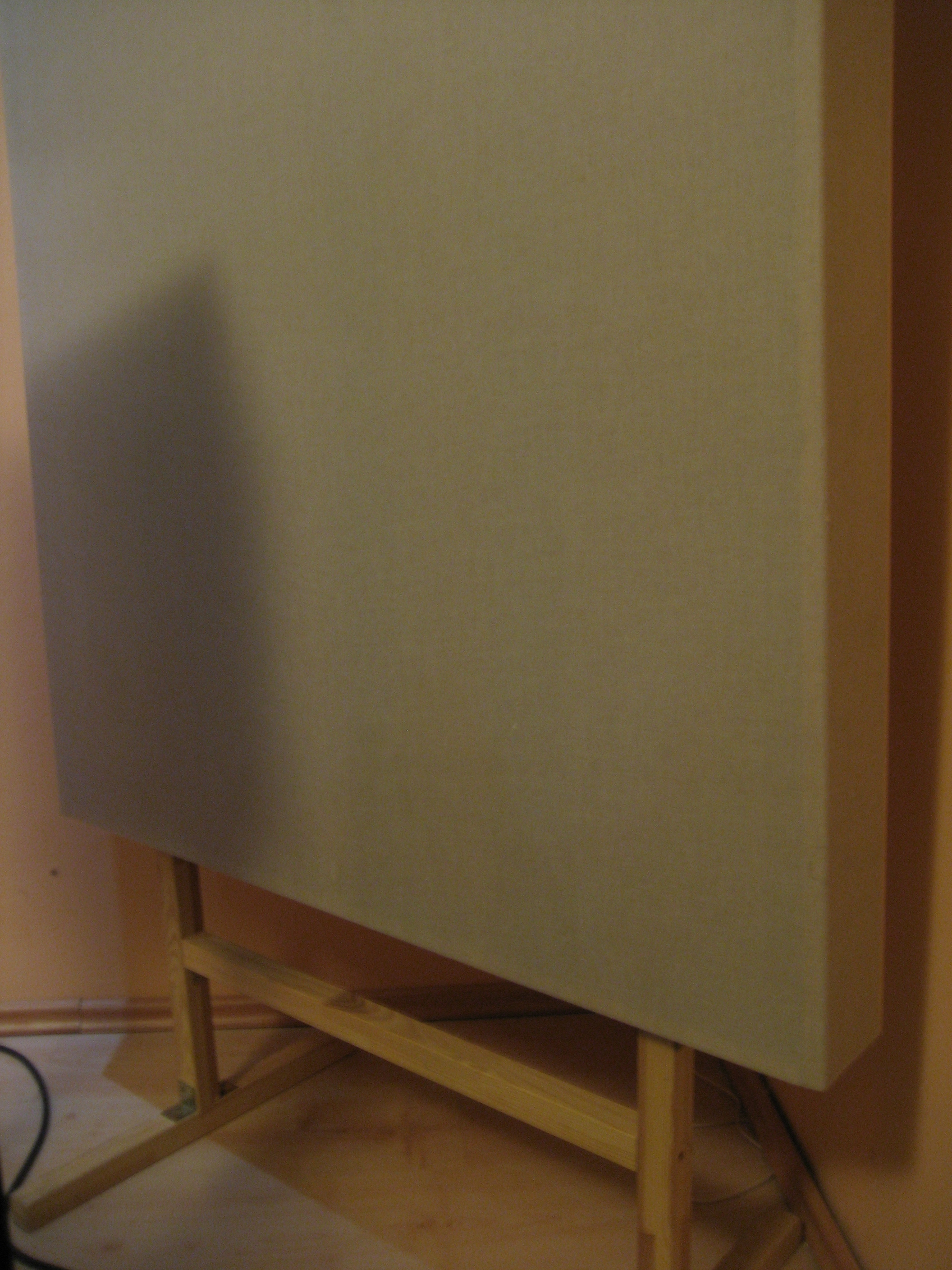 - custom made absorberji, leseno ogrodje, polnjeni s canaflex 10 cm (2 x 5 cm) in čez napeto laneno platno (največjega bom moral razstaviti, da ga sploh ven iz sobe spravim) - cena po dogovoru